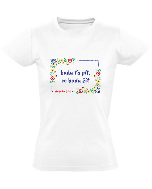 Dámské lidové tričko s krátkým rukávem – Budu ťa pít, co budu žít. Tričko pro všechny milovníky lidových vzorů, folklóru a originality. Tričko je vhodné jako originální dárek a je vyrobeno z kvalitní 100% bavlny, v prémiové gramáži 190g/m².