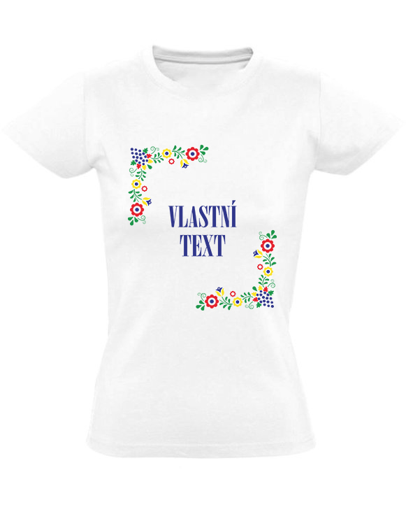 Dámské lidové tričko s krátkým rukávem – lidový vzor s možností vlastního textu. Tričko pro všechny milovníky lidových vzorů, folklóru a originality. Tričko je vhodné jako originální dárek a je vyrobeno z kvalitní 100% bavlny, v prémiové gramáži 190g/m².