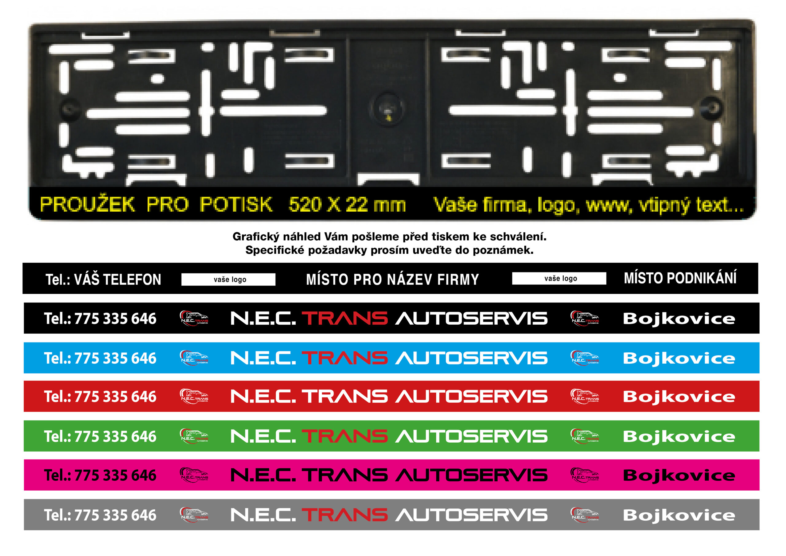 Je možné libovolně zvolit texty – název firmy, webové stránky, telefonní číslo nebo slogan.
